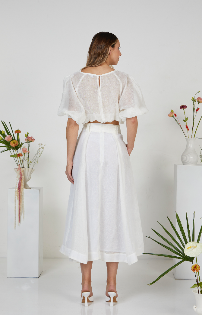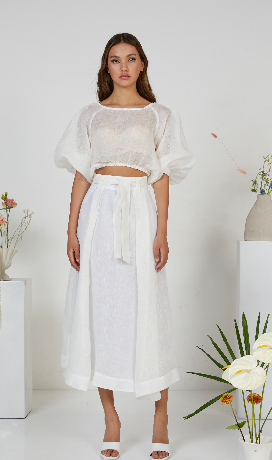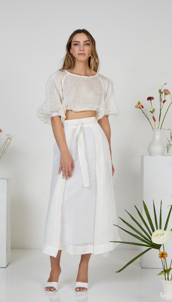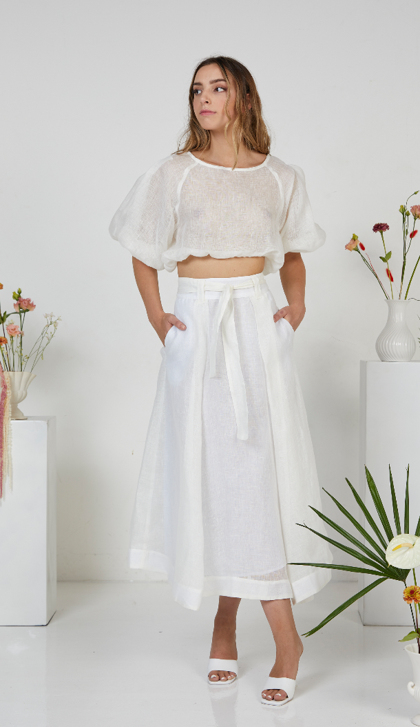 our ample a line midi skirt is made with pockets using dead stock recycled linen