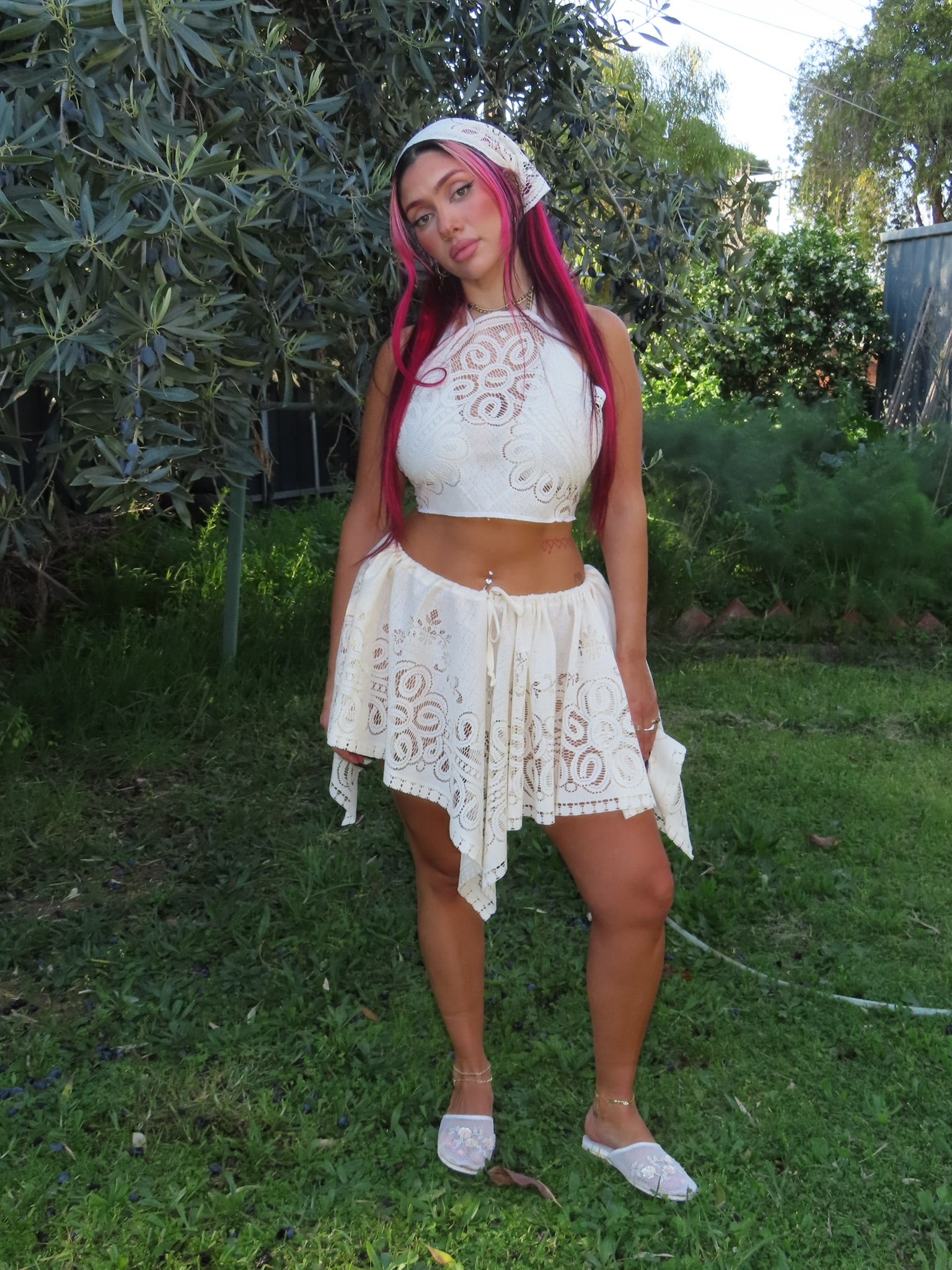the ‘sicily set’ includes three pieces, the top, the skirt and bandana.this set is multi size, with a draw string skirt and tie back halter top.